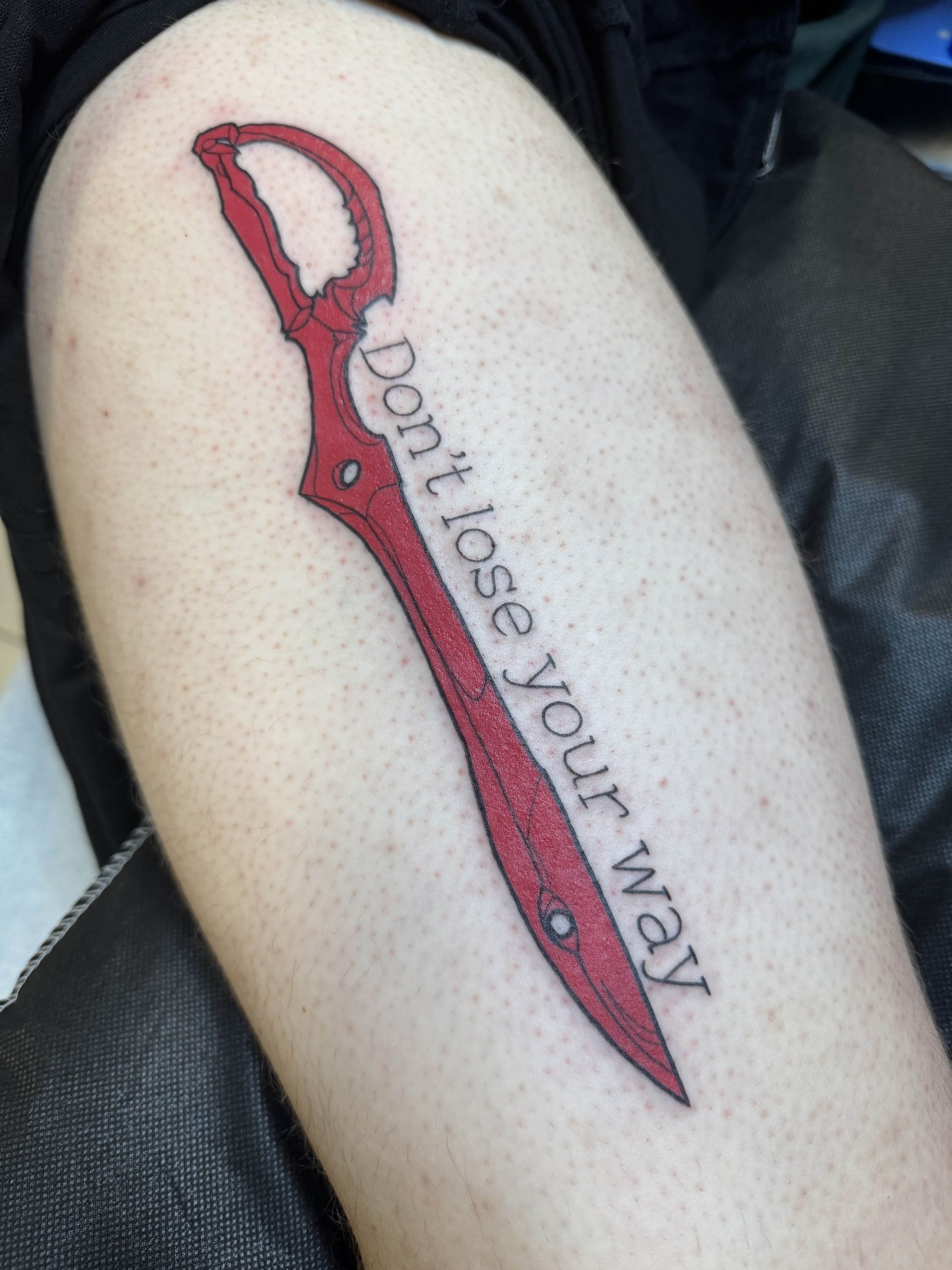 A picture of my first tattoo, on my right thigh. The image is of the sword from the anime Kill la Kill, with a line from the show along the top edge.